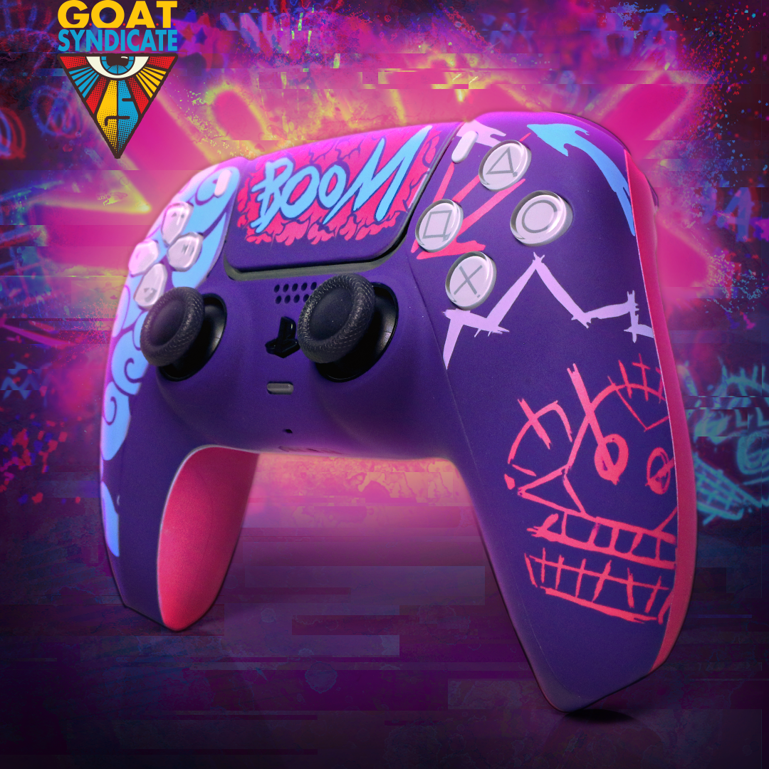 Own the chaos with this custom PlayStation 5 DualSense controller rocking a bold mix of punk attitude, graffiti grit, and pop-art energy. Splashed in electric blues, wild magentas, and layered street-style patterns, this OEM PS5 controller delivers next-gen features—adaptive triggers, haptic feedback, and precision control— topped off with a neon tag that screams rebellion. Perfect for gamers who demand pro-level audio and a look that refuses to blend in.
